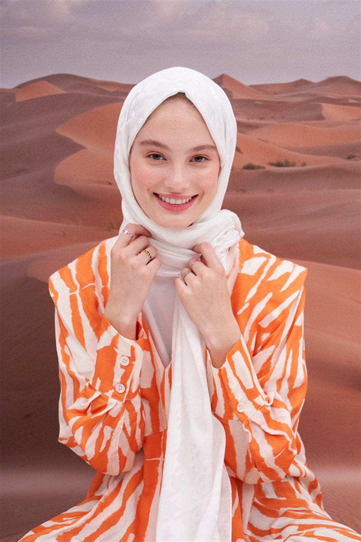 Jacquard Scarf Jacquard scarves feature self-woven patterns and a structured, elegant drape. Their firm texture is their most defining quality. Fully opaque and suitable for all seasons. Size: 75 x 195 cm Care Instructions: Dry clean recommended. If hand washing, use lukewarm water with mild detergent without rubbing. Lay flat to dry. Iron on lowest heat without steam if needed.